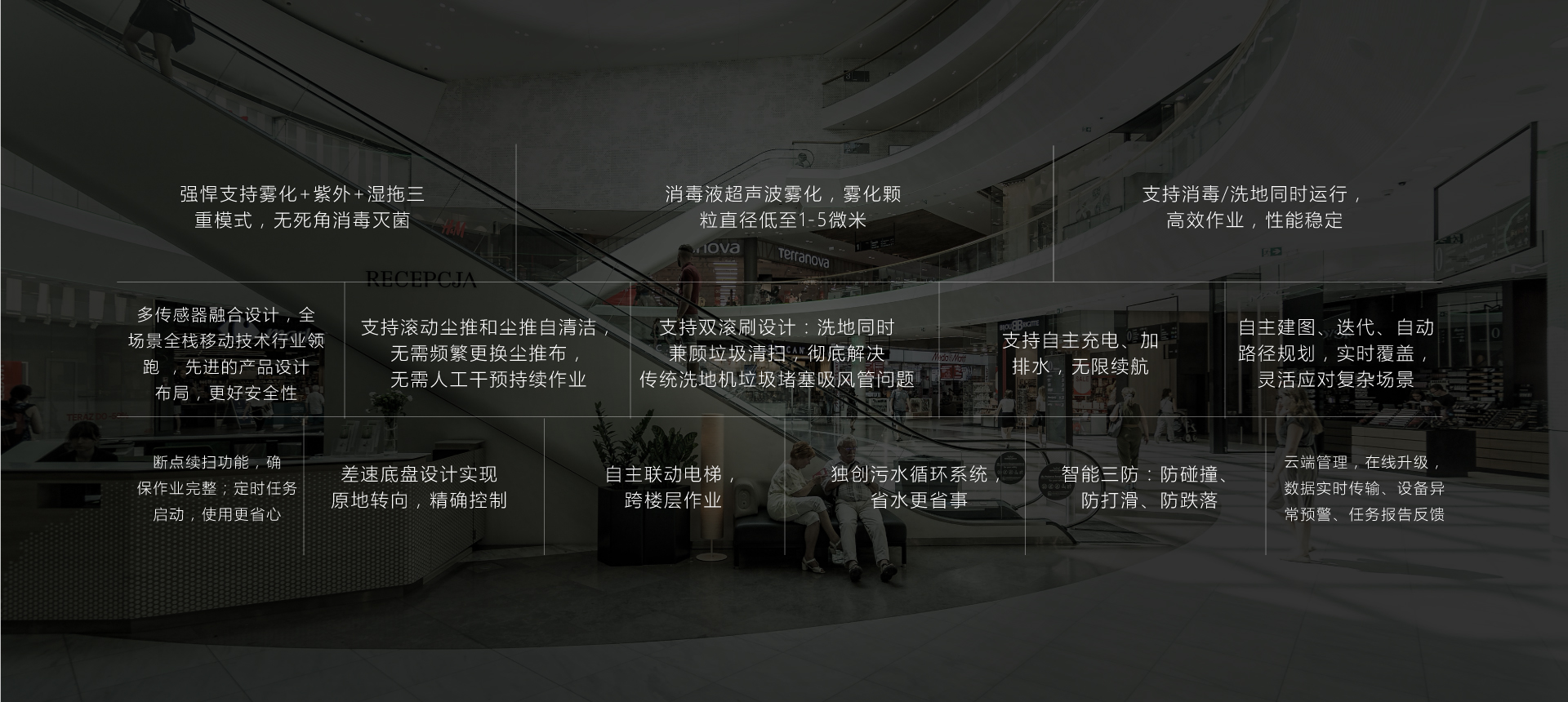 效融合,为酒店、商场、写字楼、医院、工厂物流车间等场景打造医疗级环境卫生安全。